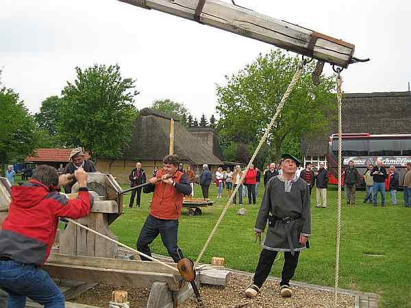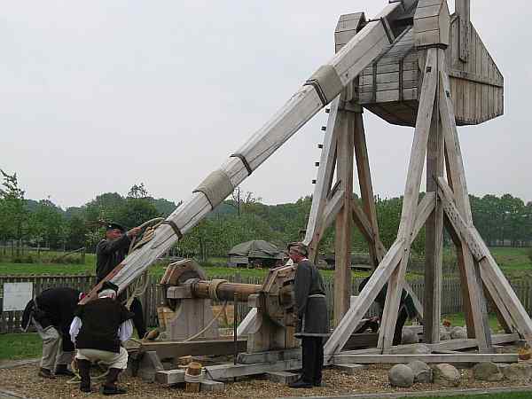 Diese Rekonstruktion einer mittelaterlichen Steinschleuder konnte 50 kg schwere Steine ca. 200 Meter weit werfen. Es wurde eine Geschwindigkeit des Geschosses von ca. 250 km/h erreicht. Bei einer Vorführung konnten wir dieses selbst miterleben. | |