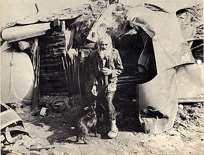 Bremer Illustrierte : Bildbericht von Peter Stelljes (von 1967)Seite 1 Die Freiheit, die er meint: . . . was andere heute tun, ist mir piepe !" Eine versponnene Welt, anziehend und abstoßend zugleich, märchenhaft und real, erschreckend und rührend: das ist Johann Klenckes Eremitage im Moor, eine knappe Autostunde von Bremen entfernt. Hier hat sich der närrische Weise mit Mieke, der glänzendschwarzen Hündin, häuslich eingerichtet. Häuslich - das ist ein wenig übertrieben. Die Wohnung ist ein halb in den Boden eingegrabenes Autowrack, in dessen dunstige Enge Klencke den Besucher mit einer chevaleresken Geste einlädt, als sei nichts Ungewöhnliches daran. Dabei ist die Sache ungewöhnlich genug. | ||||||||||||||||||||||||||||||||||||||||||||||||||||||||||||||||||||||||||||||||||||||||||||||||||||||||