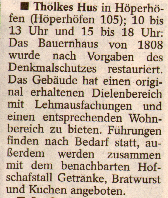 Fünf Baudenkmäler in der Samtgemeinde waren gestern für Besucher geöffnet Einblick in die Geschichte 15.09.2014 Sottrum - Einmal im Jahr - jeweils am zweiten Sonntag im September - öffnen bundesweit historische Bauten ihre Türen. In der Samtgemeinde Sottrum durften gestern gleich fünf Baudenkmäler am Tag des offenen Denkmals" bewundert werden. Das älteste Gebäude steht im Herzen der Wiestegemeinde: Die Geschichte des Turmes der Sottrumer St.-Georgs-Kirche" reicht bis in das 13. Jahrhundert zurück. Zu sehen gibt es in der Kirche das Standbild des Ritter Stankt Georg, das sich die zweijährige Theresa vom Arm ihres Papas Florian Petsch anschaute. Kompetente Auskünfte bekamen die Besucher bei der Stuckenborsteler Wassermühle. Durch die Mühle, die bis 1790 zum Adeligen Gute" Stuckenborstel gehörte, führten Uwe Kohl, Jürgen Schlüter und Hans-Richard Buthmann. Die Anzahl der Besucher ist lange nicht vergleichbar mit dem Mühlentag", resümierte Hans-Richard Buthmann. Auf viele Gäste eingestellt war dagegen Familie Klencke aus Höperhöfen, die die Türen des mehr als 200 Jahre alten Schafstalls und von Thölkes Hus geöffnet hatte. Das unter Denkmalschutz stehende Fachwerkhaus stammt aus dem Jahr 1808", berichtete Klaus Klencke. Seit dem Kauf hat das damals vom Verfall bedrohte Gebäude viel vom alten Charme zurück gewonnen. Das kommt nicht von ungefähr, denn allein an Lehm wurden bisher rund sieben Tonnen verbaut, ein Ende ist noch nicht absehbar. Um den Charakter zu wahren, werden derzeit mehr als 200 Jahre alte Fliesen eingebaut. Die Fliesen kommen aus Frankreich, ich habe sie über Ebay gekauft", verriet Klencke. Besonders interessant sind auch die Kopien der Dokumente, die bis zum Jahr 1695 zurückgehen. Die Originale wurden von Silke und Klaus Klencke beim Aufräumen im Sekretär des Hauses gefunden. Zwischen den beiden historischen Gebäuden machten es sich die Gäste, zu denen auch die Mitglieder der Feuerwehr gehörten, die ihren Frühschoppen dorthin verlegt hatten, gemütlich. In Jeerhof kümmerten sich die Mitglieder der Boitzter Spinnstuv um die Präsentation der Kornscheune aus dem Jahr 1719. |