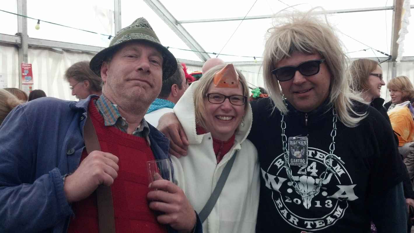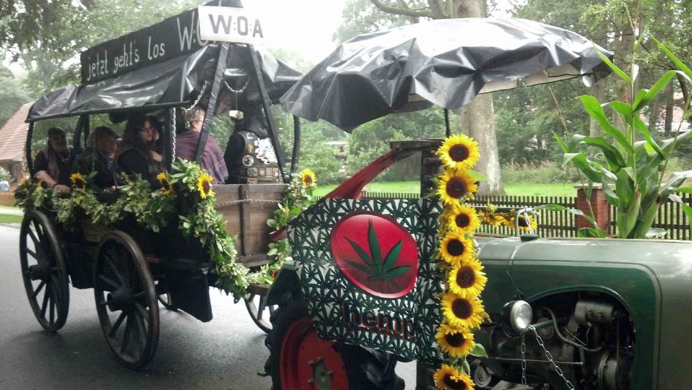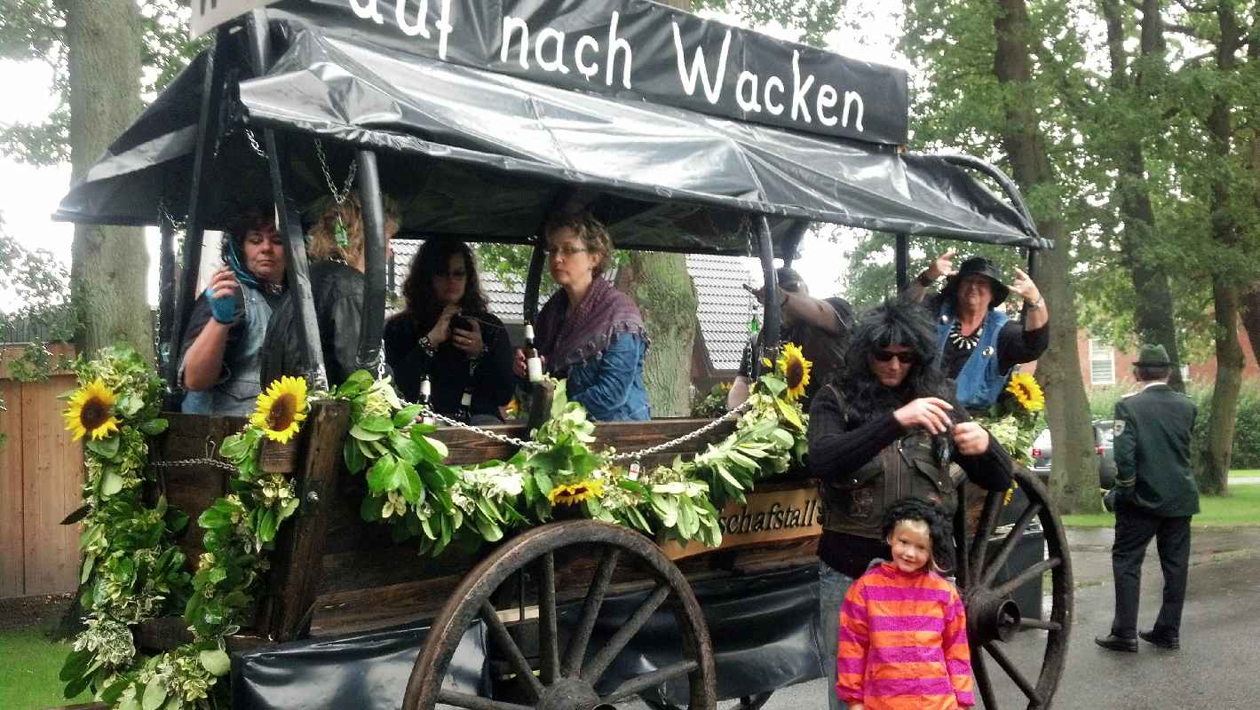 Erntefest der Gemeinde Botersen war trotz Regen ein Erfolg 14 aufwendig gestaltete Gefährte rollten durch Botersen, Höperhöfen und Jeerhof Vorsitzende des Schützenvereins. Darüber hinaus standen Vorführungen von den Kindern des Kindergartens Botersen, der Kindertanzgruppen Heimatverein Eisdorf, Boitz-ter Spinnstuv und Power Dance sowie der Landjugend auf dem Programm. Anschließend ging's, wie schon am Vorabend, ans Feiern: Die mobile Discothek Bobbys sorgte für Stimmung. Zum ersten Mal hatte der Schützenverein Bötersen-Hö-perhöfen entschieden, dass der Ernteumzug nicht nur durch einen Teil der Gemeinde rollen sollte - diesmal wurden alle Straßen in Botersen, Höperhöfen und Jeerhof abgefahren. Die bunt geschmückten und aufwendig dekorierten Wagen hatten sich in zwei Gruppen aufgeteilt und passierten so jedes Haus in der Umgebung. Allein die Ankunft beim Gasthaus Hoops verzögerte sich etwas -einer der Anhänger war auf dem Acker am Startpunkt liegengeblieben und sorgte so für eine kleine Zeitverschiebung. Nichtsdestotrotz waren 13 Wagen am Start - Ein tolles Ergebnis", wie der stellvertretende Bürgermeister Gerhard Blödorn fand, der Schnäpse an die Feierwütigen verteilte. Diejenigen, die sich trotz Regens mit Schirmen bewaffnet auf die Straße getraut hatten, um dem Tross zuzuwinken, bekamen allerhand aufwendig gestaltete Gefährte zu Gesicht: Dazu gehörte beispielsweise die Höperfarm, die von einem Oldtimer-Trek-ker gezogen wurde und auf der sich Jung und Alt als Huhn, Kuh, Katze und Schwein verkleidet hatten. Ebenfalls ein Hingucker war der Wagen der Fischer vom Höpfersee, der von einer Meerjungfrau angeführt wurde. Für Aufsehen sorgten aber vor allem die Höperhöfener Fans des Rockfestivals Wacken, die sich in Lederkluft geschmissen hatten. Ähnlich sah es beim Motorrad-Club aus, der auf der Rückseite seines 'Wagens immer wieder den Motor eines Zweirades aufheulen ließ und Mit qualmenden Reifen für dicke Rauchschwaden sorgte. Nach der Abholung des Bötersener Erntemeisters ging es endlich ins Trockene: Im Festzelt in Höperhöfen warteten warme Getränke und Kuchen auf die Teilnehmer. Während des Festaktes folgte das traditionelle Einbringen der Erntekrone durch die Landjugend Botersen und die offizielle Begrüßung durch Doris Lusch, Vorsitzende des Schützenvereins Bötersen-Höperhöfen. | ||||||||||||||||||||||||||||||||||||||||||||||||||||||||||||||||||||||||||||||||||||||||||||||||||||||