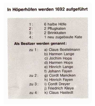 Geschichtliche Entwicklung Die erste Erwähnung des Dorfes Höperhöfen datiert aus dem Jahre 1367. In einer Urkunde des Lüder von Tzarnhusen werden je ein Hof in Bötersen und Hope aufgeführt. Aus dem damaligen Namen Hope ist das heutige Höperhöfen geworden. Die Erklärung des Namens ist eindeutig. Hope ist die niederdeutsche Bezeichnung für Hügel oder Anhöhe. Und dass Höperhöfen auf einem Hügel liegt, ist nicht zu übersehen. Der in der hiesigen Gegend häufig anzutreffende Familienname Hops dürfte aus dem Ortsnamen entstanden sein. Auf dem Hof Höperhöfen Nr. 6 ist mindestens seit Anfang 1600 der Familienname Hops vorhanden und über viele Generationen bis auf den heutigen Tag erhalten geblieben. | ||||||||||||||||||||||||||||||||||||||||||||||||||||||||||||||||||||||||||||||||||||