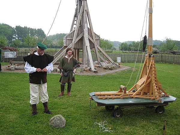 Diese Rekonstruktion einer mittelaterlichen Steinschleuder konnte 50 kg schwere Steine ca. 200 Meter weit werfen. Es wurde eine Geschwindigkeit des Geschosses von ca. 250 km/h erreicht. Bei einer Vorführung konnten wir dieses selbst miterleben. | |