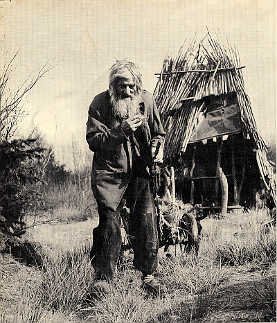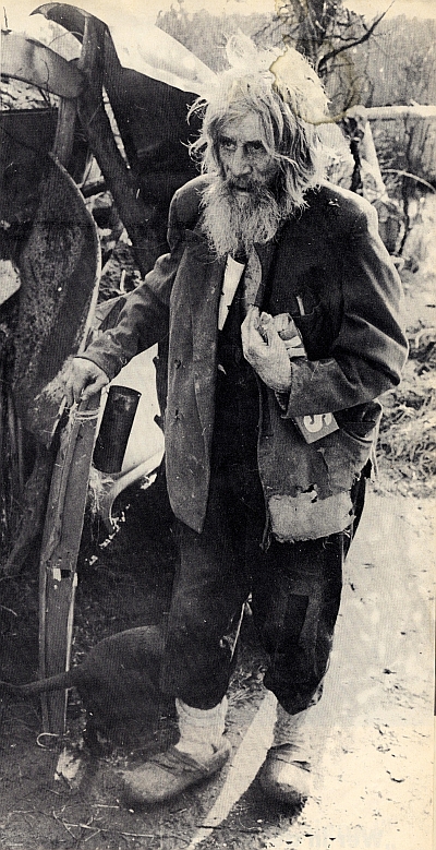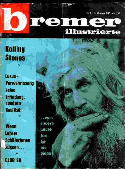 Bremer Illustrierte : Bildbericht von Peter Stelljes (von 1967)Seite 1 Die Freiheit, die er meint: . . . was andere heute tun, ist mir piepe !" Eine versponnene Welt, anziehend und abstoßend zugleich, märchenhaft und real, erschreckend und rührend: das ist Johann Klenckes Eremitage im Moor, eine knappe Autostunde von Bremen entfernt. Hier hat sich der närrische Weise mit Mieke, der glänzendschwarzen Hündin, häuslich eingerichtet. Häuslich - das ist ein wenig übertrieben. Die Wohnung ist ein halb in den Boden eingegrabenes Autowrack, in dessen dunstige Enge Klencke den Besucher mit einer chevaleresken Geste einlädt, als sei nichts Ungewöhnliches daran. Dabei ist die Sache ungewöhnlich genug. | ||||||||||||||||||||||||||||||||||||||||||||||||||||||||||||||||||||||||||||||||||||||||||||||||||||||||